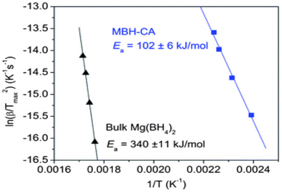 Yan et al. [135] studied the effect of carbon nanocomposites on the reversibility of Mg(BH4)2. The Mg(BH4)2–carbon nanocomposites were synthesised by the milling of MgH2 nanoparticles supported on carbon aerogel under a B2H6–H2 atmosphere. The result indicated that the decomposition temperature of as-synthesised Mg(BH4)2–carbon nanocomposites decreased to 160 °C compared with the undoped sample. For the rehydrogenation process, the formation of Mg(BH4)2 occurred under moderate pressure and temperature (80 to 150 bar H2 and 200 °C). From the Kissinger analysis, the apparent activation energy for the dehydrogenation process in the Mg(BH4)2–carbon aerogel sample was reduced by 238 kJ mol−1 compared with undoped Mg(BH4)2, as presented in Figure 10. According to Yan et al., the significantly improved H2 storage properties of Mg(BH4)2 catalysed with carbon nanocomposites may be due to the effect of nanoengineering modification. It is believed that the smaller the particle size, the more the H2 storage properties of complex metal hydrides are improved, as proven in the previous studies on LiBH4 and MgH2 nanocomposite systems [139,140,141].