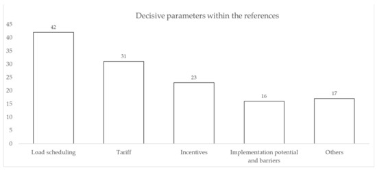 The decisive parameters of demand response can be listed as load schedule, tariff, incentives, and others. From a thorough review of the last 10 years of demand response research, narrowed to 81 publications, 42 papers (33%) listed load schedule as a key parameter. The research papers having electricity price as a decisive parameter represent 24% of the references (31 articles). Twenty-three papers stipulated incentives as a key parameter, representing 18%. Sixteen papers (13%) listed implementation potential and barriers. Seventeen papers were listed in the “others” category, representing 13%. Figure 2 shows the distribution of the decisive parameters mentioned in the selected literature. References often list several decisive parameters; therefore, the number of occurrences exceeds the number of references.