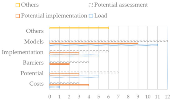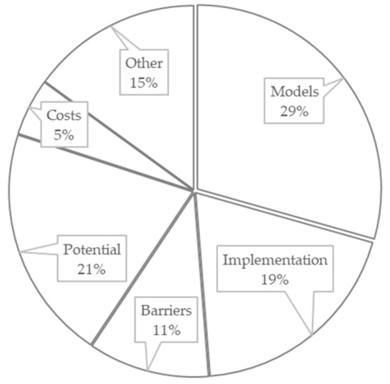 The research contributions can be classified as models, implementation, barriers, potentials, and costs. As described in Figure 3, most of the literature is focused on models and the works on costs and barriers are limited.
