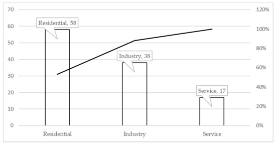 When sorting the literature on demand response according to the respective sectors as shown in Figure 4, 58 of the 81 selected publications relate to the residential sector, 38 of the 81 selected publications relate to the industrial sector, and 17 papers within the selected literature were linked to the service sector. Some studies include several sectors in their analysis and that is why the total number of contributions over all the sectors exceeds the number of references.