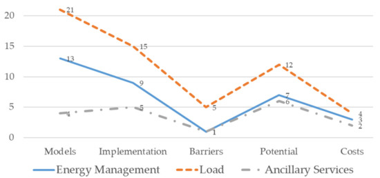 When attempting to categorize research related to demand response, and because each study focuses more or less on a different aspect around which revolves the argumentation, five main keywords stand out: demand response, ancillary services, power management, load, and others. “Energy Management” can be linked to 41% of the literature, “Load” to 34%, “Ancillary Services” to 19%, and “Others” to 6%, as shown in Table 1.
