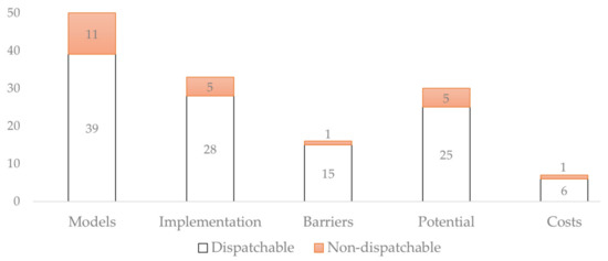 According to Figure 9, the research on dispatchable DR is evenly distributed among the different subsections. For non-dispatchable DR, the research on DR costs and barriers is scarce. Olsen et al. [33] focused on the costs from non-dispatchable DR applied to a cement plant’s kiln. He inquired about the equipment, operation limitations, and the amount of energy needed for the manufacturing process. He elaborated on cement plants changing their consumption habits following incentives from public utility companies. Pang et al. [70] investigated the case of the secondary sector in the western part of Inner Mongolia. They listed the barriers to load shifting and estimated the realizable potential. More research on costs and barriers in the field of non-dispatchable DR is needed to fill the gap.