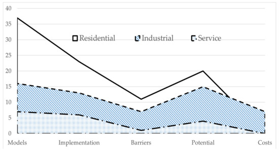 Demand response is implemented in the residential, industrial, and service sectors. Figure 10 summarizes a cross-analysis of the last 10 years of selected demand response literature.