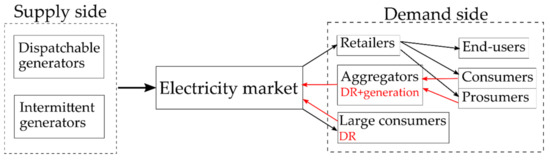 Among the literature listing the tariff as a decisive parameter, Good [41] used a demand response model considering behavior economics. He investigated how the energy costs and the time necessary for thermal comfort of inhabitants influence the peak electricity price offered by the grid operator. The purchaser of demand response (electric company) should promote and advertise for DR participation which is a prosocial behavior. Yalcin et al. [42] investigated the case of water transfer stations and showed that through DR control, electricity usage and electricity bills could be reduced. Electricity fees were lowered by 58% resulting from a better system design that is more efficient with less energy wastage. Nilson et al. [43] detailed the different opinions of the households concerning demand response strategies and how the incentives could increase the participation of the consumers. Their results show that compared to environmental incentives, price incentives are the most appropriate because it is the most efficient strategy to support the flexibility of the demand. Tahir et al. [44] showed the necessity for demand side management and estimated the reforms in the demand response strategies to be made by the electricity department to promote demand response planning. Tahir et al. mentioned that DR development in Asia is far behind Europe or the US; they described the DR programs and the pilot projects in place in China. According to them, the barriers to DR implementation are having a centralized electrical system, lack of education programs, low difference between peak and valley prices, few incentives, no return on investment for companies taking part in DR, limited availability of smart metering infrastructure for communication with the utility company, and absence of automated load control installations for smart homes. Among their propositions to overcome these barriers, they believe that aggregators could have a major impact as those would serve as mediators between the utility companies and the consumers by informing consumers on the DR benefits and giving detailed load shedding estimations to utilities. With the increased availability in small-scale local intermittent RE generation and the gradual transition towards a smart grid, the numbers of small capacity prosumers increases. These need to be aggregated to reach minimum capacity for market bidding. In other words, prosumer participation in the electricity market relies on aggregators. Both flexibility and generation can be traded on the market. Consequently, aggregators, by increasing the market exposure of prosumers contribute to reaching climate change mitigation objectives. They will officially (according to the EU electricity directive [45]) be new independent stakeholders in the European electricity markets.