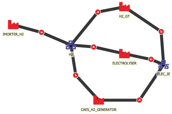 SpineOpt has been designed as a generic energy system modelling framework and it does not assume specific types of energy carriers or sectors. A wide variety of energy systems, technologies and transport physics can be implemented using the fundamental elements of nodes (representing balance, storage and demand), connections (representing transport) and units (representing conversions). Any number of sectors can be included and co-optimised within the model and arbitrary energy conversion units can be added. SpineOpt is a powerful tool when considering a high degree of sector coupling and when modelling emerging technologies, such as electrolysers and Hydrogen-fueled CAES. This Section provides more details of the Hydrogen technologies included in the model. These include electrolysers for the conversion of electricity to Hydrogen, CAES and Hydrogen turbines for electricity generation and both the underground Hydrogen and compressed air storage. Figure 1 shows a simplified version of the Hydrogen node (labelled “H2”)as implemented in the SpineOpt model. In the diagram the SpineOpt objects of units are in red and nodes are in purple, while the black lines represent the relationships between the various objects on which the various model parameters are defined. The red arrows indicate the direction of flow. The Hydrogen node has an associated time varying demand, with the time series depending on the year and the scenario. Storage can be added to the node in SpineOpt by giving the node a state, and for existing storage, defining a node state capacity . For nodes with storage investments enabled, represents the storage capacity per storage investment, which is set at 1 MWh in this model. An importer unit (labelled “Importer_H2”) allows “blue Hydrogen” to be imported to the Hydrogen node based on cost estimates for the relevant years. “Blue Hydrogen” is assumed to be an important transitional fuel while “green Hydrogen” scales up. As such, the importer capacity is sized to meet the Hydrogen demand in the 2030 GA scenario. Additional Hydrogen demand, including increases assumed for 2040 scenarios, must be met by the generation of “green Hydrogen”. The Hydrogen node, and any invested storage capacity at the Hydrogen node, i.e., underground Hydrogen storage, is connected to the electricity node (labelled “ELEC_IE”) via three different unit types: electrolysers, Hydrogen CAES and as an alternative, a Hydrogen gas turbine.