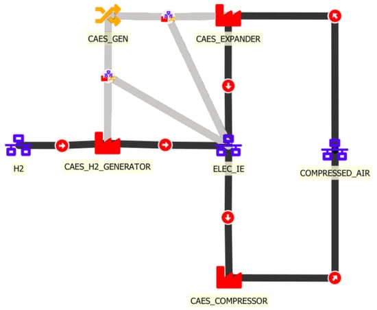 The CAES plant uses similar generic constraints to describe its operation. However, the CAES plant is slightly more complex, and is modelled as 3 separate units connected to 3 different nodes. Figure 2 shows a simplified implementation of the CAES plant in SpineOpt (for clarity, temporal blocks and stochastic structures are omitted). As per Figure 1, the units are shown in red, and the nodes are in purple. In addition, the yellow symbol represents user defined constraints. The black and grey lines represent various relationships between the model objects, with the black lines also representing flows, with the arrows indicating the direction of flow. Equation (4) is applied to the air compressor unit ( in Figure 2) which defines the relationship between the flow of electricity from the electricity node and the flow of air to the compressed air storage node. On the generation side, the CAES plant is modelled as two additional units, and in Figure 2, and once again, Equation (4) determines the relationship between the flow of compressed air and Hydrogen from their respective nodes and the flow of electricity from the two units, the combined flow being the power output of the plant. As the two generating units do not operate independently, a further user constraint is applied linking the output of the two units. SpineOpt’s user constraint allows the user to define arbitrary linear constraints involving most of the problem variables. Equation (5) shows an instance of the generic user constraint with all the relevant parameters, which allows the relationships between the various flows of the CAES generating units to be captured, with the index representing the user constraints. In summary, the CAES plant is represented in Spine as three different units, with independent investment variables and associated annualised costs, and a compressed air node, which also has an associated investment variable and annualised investment cost. Equation (4) is used to quantify the efficiency of each unit component of the plant and the user constraint, Equation (5), links the operation of the CAES generating units (air expander and H2 generator). This methodology allows for a detailed representation of the CAES plant at an hourly resolution in terms of fuel use (both Hydrogen and compressed air) and electricity generation. The state of the compressed air node (i.e., energy content of the compressed air cavern) is also modelled at an hourly resolution and the plant operation is co-optimised as part of the overall investment problem.