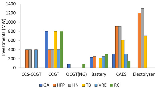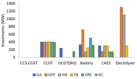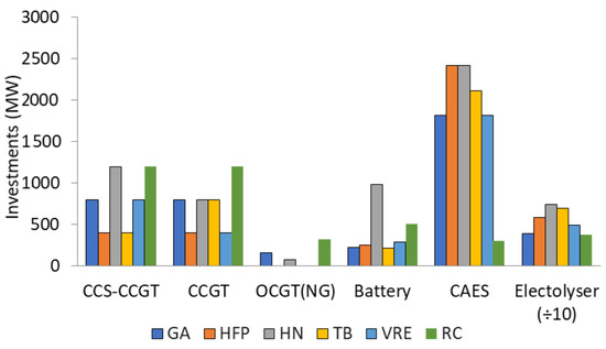 Figure 3 shows the capacities of dispatchable generation selected for investment by the 2030 investment models under the different scenarios. A high level of investments in electrolysers occur in the HFP and HN scenarios, with a lower level of investments occurring in the TB scenario triggered by the lower costs and higher efficiencies. However in the other three scenarios no investment in Electrolysers occur. Electrolyser investments are coupled with strong investments in Hydrogen CAES plant, and for the HN scenario, the flexibility and load shifting provided by the electrolysers and CAES suppresses battery investments.