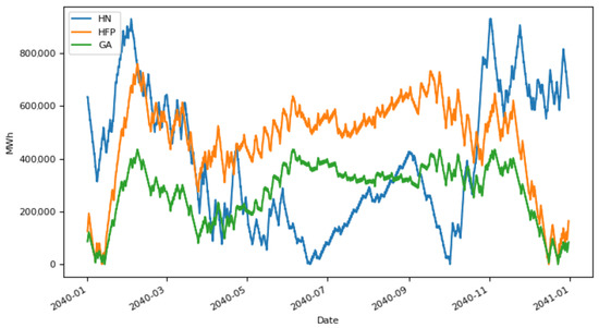 Trajectories of the state of charge of the underground Hydrogen storage for the 2040 scenarios—GA (green), HFP (orange) and HN (blue).