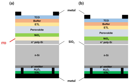 Schematic of 2-T perovskite/TOPCon tandem solar cell, where (a) indium tin oxide (ITO) and (b) NiOx/n+ poly-Si direct contact.