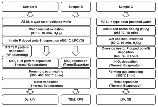 Samples A, B, and C were prepared and analyzed by following process. A schematic of process flow for the fabrication of sample A, B, and C is shown in Figure 2.