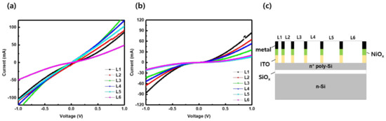 First, the contact properties of the two different structures—NiOx/n+ poly-Si and NiOx/TCO/n+ poly-Si—were measured and compared. Figure 3a,b show the dark I–V characteristics of the samples before and after ITO annealing. Non-ohmic I–V was measured as shown in Figure 3a,b. Furthermore, during the annealing process the SiOx phase was formed between the n+ poly-Si and the ITO [22], which increased the Schottky barrier width and threshold voltage (0.16 -> 0.35 V) of the n+ poly-Si/ITO/n+ poly-Si Schottky diode.
