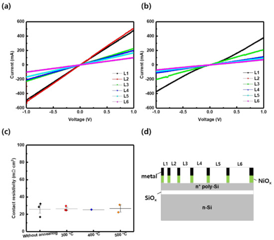 Contact properties of samples without TCO were also measured using the method described above. Figure 4a,b show that the contact between NiOx/n+ poly-Si showed ohmic behavior both before and after annealing. Significantly, the contact resistivity measured by the TLM method was about 30 mΩ·cm2, which was a low value considering that it was an entire surface contact. After annealing, the contact resistivity corresponded to before annealing the sample, as shown in Figure 4c.