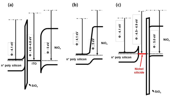 Energy band diagrams of: (a) NiOx/ITO/n+ poly-Si; (b) NiOx/n+ poly-Si; (c) NiOx/Ni silicide/n+ poly-Si.