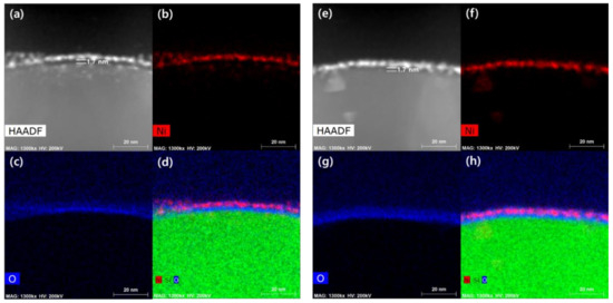 Comparison of NiOx layer on n+ poly-Si: (a) with annealing; (e) without annealing; (a,e) scanning transmission electron microscopy (STEM) images; (b–d,f–h) energy dispersive spectroscopy (EDS) mapping images.