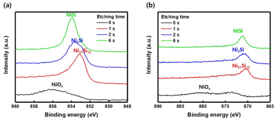 The chemical state of the diffused Ni atom in n+ poly-Si was analyzed. A nickel silicide peak was detected using depth profiling XPS. Figure 7a,b show the XPS spectra of Ni 2p3/2 and 2p1/2 as a function of the depth position. The spectra of Ni 2p3/2 showed the Ni31Si12 peak at 853.0 eV (1 s), the Ni2Si peak at 853.4 eV (2 s), and the NiSi peak at 853.9 eV (6 s). Likewise, the spectra of Ni 2p1/2 showed the Ni31Si12 peak at 870.2 eV (1 s), the Ni2Si peak at 870.6 eV (2 s), and the NiSi peak at 871.2 eV (6 s) [26]. As the etching time increased, the nickel silicide peak shifted to the left. These results indicated that the nickel silicide phase shifted from Ni rich silicide to the NiSi phase, depending on the depth. As a result, the nickel silicide formed during the evaporation process of NiOx was placed on NiOx/n+ poly-Si interface and assisted the contact between the two layers, which finally resulted in an ohmic contact and a low contact resistivity.