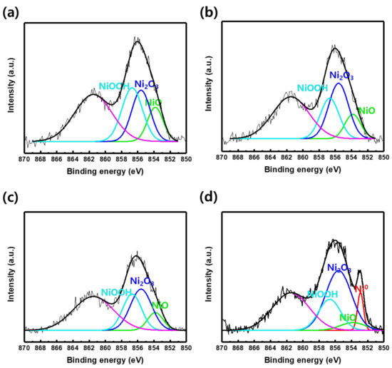 XPS spectrum of Ni 2p3/2 according to: (a) as-deposited; (b) 300 °C; (c) 400 °C; (d) 500 °C annealing temperature.