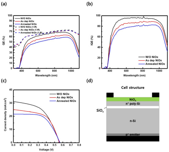 In the previous TEM and XPS analyses, the silicide formation and the Ni3+/Ni2+ ratio increase was confirmed. For further confirmation on how the characteristics of the TOPCon bottom cell changed with respect to NiOx deposition and annealing, the structure shown in Figure 9d was fabricated. Figure 9 shows the external and internal QEs and JV curves of the NiOx/TOPCon sample. Regardless of the NiOx deposition and annealing, the reflectance of the samples was almost the same. However, the QE data decreased overall after the NiOx deposition and annealing, which was due to the parasitic absorption of nickel silicide [30]. Significantly, nickel silicide had high absorption coefficient at short wavelength [31]. As a result, Figure 9b shows further decrease in IQE at short wavelength in the case of NiOx deposition and annealing. As shown in Figure 9c and Table 1, Jsc also decreased after NiOx deposition and annealing, similar to the trend observed with QE. On the contrary, FF increased from 53.55% to 63.07% from without NiOx to after NiOx annealing. These results indicate that the front surface sheet resistance was improved. Ni diffusion from NiOx formed nickel silicide that assisted carrier transport. Ni3+/Ni2+ ratio of NiOx thin layer was also affected by Ni diffusion. Consequently, lateral conductivity of NiOx and n+ poly-Si interface was seen to improve.