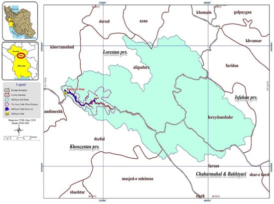 39]. The river originates from the heights of the Zagros Mountains in the south-east of Dorud and Aligudarz. The highest elevation of the catchment is 4080 m above sea level. Approximately 3.1 km downstream from the dam site, the Cezar and Bakhtiari rivers meet each other to form the Dez river. The dam site will be located at 50°46′48″ E and 41°57′32″ N. The Bakhtiari Dam will be a part of the cascade in the Dez-Karun river basin. The Dez dam is located approximately 76 km below Bakhtiari site, and was commissioned in 1978. It is 203.5 m tall with a storage volume of 3339 Mm