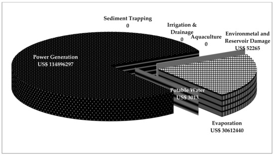 3). It should be pointed out that HECAM II could compute the cost of sedimentation. However, this option was not considered in the calculations due to the sediment trapping capability of Bakhtiari Dam. In order to calculate the total income of sediment trapping, the model uses the cost of sediment trapping of downstream dams. This reduction in the costs of sediment trapping is considered as an income and an advantage of damming, which is considered as the model input. In addition, the sediment trapping performance of the dam increases the volume of available water for industrial, agricultural and drinking uses. The HECAM II model estimates the total revenue in terms of the increase in available water by calculating the value of each additional cubic meter of water according to the water needs of downstream areas, as given in Equation (20).