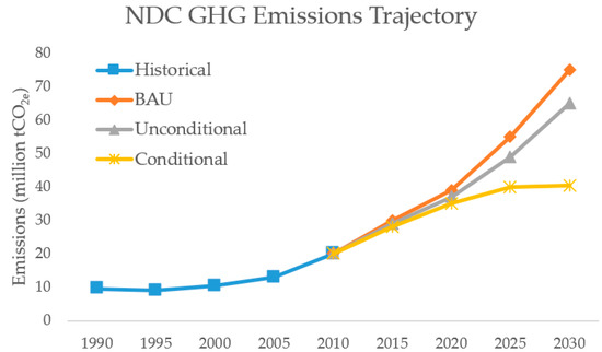 Ghana’s GHG emission reduction trajectory in the NDCs [5].