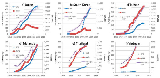 Historical ownership trends of car (CAO) and motorcycle (MCO) and GDP per capita [12] (a) Japan, (b) South Korea, (c) Taiwan, (d) Malaysia, (e) Thailand, and (f) Vietnam.