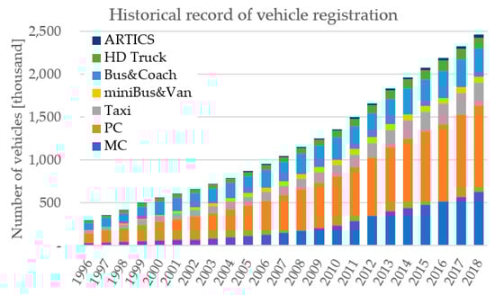 Available historical data (1996–2018) in Figure 3 enables validation of a vehicle number model which is used to project vehicle number development between 2019–2036. The projected vehicle numbers are assembled with ‘car survival’ and vintage profile’, to define vehicle stock-turnover rate in the LEAP program.