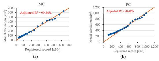 where GDPpCap is gross domestic product per capita, and a and b are model coefficients. Otherwise, logarithmic function is used for the public low occupancy vehicles (miniBus & Van) and the heavy-duty trucks (HD Trucks and ARTICS). Logarithmic function was chosen because the number of these vehicles is not related to the saturation level (S), and the function will not over-predict in long-term projection, as used in References [45,46]. The developed models of vehicle population in vehicle categories according to Table 1 are shown with adjusted coefficient of determination (adjusted R-squared, ) in Table 2.