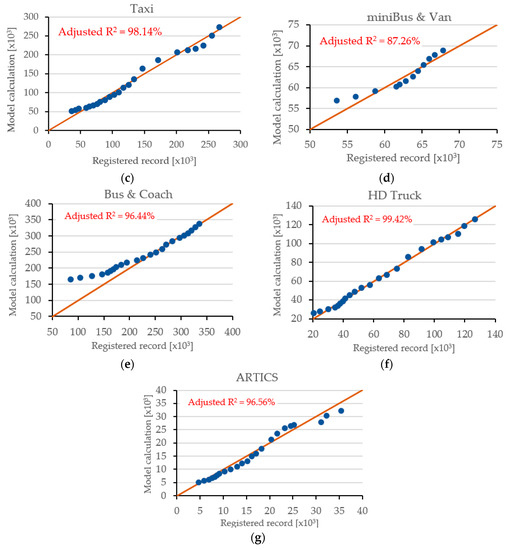 Validation of vehicle population models (a) Motorcycle, (b) Private vehicle, (c) Taxi, (d) Mini bus and Van, (e) Bus and Coach, (f) Heavy-duty truck, and (g) Articulated truck.