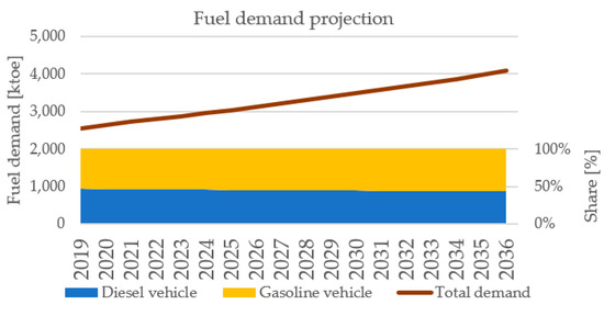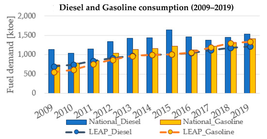 The developed model was validated by comparing calculated results obtained from LEAP [38] with historical records for both vehicle population and energy demand. As mentioned above, vehicle registration and fuel demand records were taken from DVLA [14] and NPA [42], respectively. Calculated vehicle numbers from the logistic and logarithmic functions fit well with the historical data, as shown in Figure 4. On the other hand, the calculated energy demands are lower for both diesel and gasoline fuels, as shown in Figure 5. The calculated values tend to be higher than the historical records. Noticeable difference in diesel fuel indicates that some portion of diesel fuel is consumed by other vehicles and equipment, i.e., agricultural and industrial sectors, which is slightly different from the assumption that the entire fuel usage is attributed to transport sector. Yet, the transport sector remains the largest contributor to fossil fuel usage [48], and the model is adequately robust for the calculation. Better agreement between actual and calculated values in gasoline fuel indicates that gasoline fuel demand depends heavily on the road transport sector.