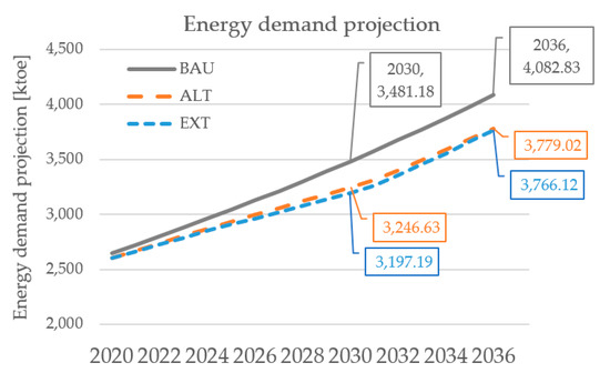 There are three scenarios considered in this study. First, the Business as Usual (BAU) scenario was defined from the current situation, as a baseline trend of energy consumption and GHG emissions in the road transport sector. The other two scenarios were developed as the guideline measures for biofuel integration in two possible levels of GHG mitigation, namely the alternative (ALT) and extreme (EXT) scenarios. In both the ALT and EXT scenario, the share of NG vehicles was included for the transport sector in the same approach to increase more cleaner gaseous fuels as in the power generation sector [10,50]. On the other hand, electric vehicles were also included for motorcycles, private passenger cars, taxis, mini vans, and buses, followed the “Drive Electric Initiative (DEI)” supported by the Energy Commission, Ministry of Energy of Ghana [51]. Electric vehicle penetration will indicate the impact of vehicle fuel economy improvement. Gas vehicles and electric vehicles will each achieve 10% by 2030 in both ALT and EXT scenarios by replacing shares of gasoline and diesel vehicles, proportionally (Figure 6).