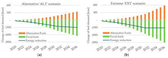 Fuel switching and energy reduction: (a) alternative scenario and (b) extreme scenario.