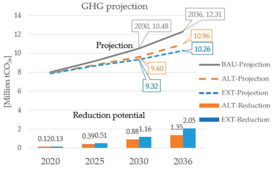 Figure 9 shows the projection of GHG emissions from the road transport sector. The results show that the road transport sector will contribute to 14.2% of the whole country’s GHG emissions (Figure 10) in 2030. ALT and EXT scenarios can tear down the GHG emissions by introducing the electric vehicle technology (by improving fuel economy) and biofuel integration (apply carbon neutral fuels). GHG emission of ALT and EXT scenarios was lower than BAU scenario by 8.4% and 11.1% in 2030, and by 11.0% and 16.7% in 2036. The results show that biofuel integration measures offer only a moderate effect on GHG emission mitigation because the considered measures applied on new vehicles. The conventional vehicles in the road transport system require a period of replaced time. On the other hand, the calculated results confirm that GHG mitigation measures should be diversified. In addition, the results indicate that the impact of biofuel integration has higher potential on GHG mitigation than the impact on reducing energy demand.