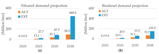 Projection of biofuel consumption in Alternative and Extreme scenario: (a) ethanol and (b) biodiesel.