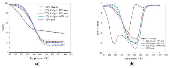 Nadziakiewicz [9] studied the co-combustion of sludge and coal by thermogravimetric (TG) analysis and concluded that the substances contained in sludge strongly affect mixing and combustion. In actual co-combustion conditions, thermal power plants must strictly control the mixing ratio of sludge and the substances it contains. Folgueras et al. [10] pyrolyzed coal and sludge at a heating rate of 20 K/min after mixing it and found that the temperature at which the volatile powder precipitates from the mixture of pulverized coal and sludge lags behind that of single sludge, and the ignition point is delayed. Calvo et al. [11] studied the characteristic pyrolysis curve of sludge under different atmospheres and found no significant variation in sludge pyrolysis under these conditions.