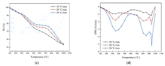 Co-combustion at different mixing ratios: (a) TG curve (dry gas atmosphere); (b) DTG curve (dry gas atmosphere); (c) TG curve (N2 atmosphere); (d) DTG curve (N2 atmosphere).