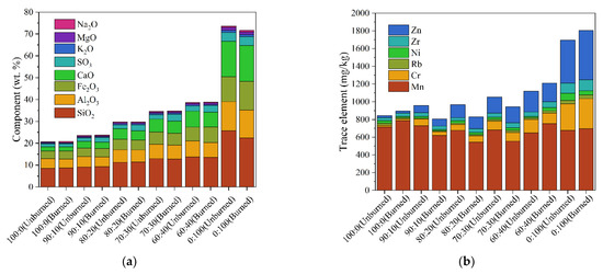 As is shown in Table 3 and Figure 2b, both coal and sludge contain similar levels of Mn and Rb, so the content of the above elements did not change significantly with an increasing mixing ratio. The sludge contained significantly larger amounts of Cr, Zr, Ni, and Zn, and the content of these elements observably increased with the increase in the mixing ratio.