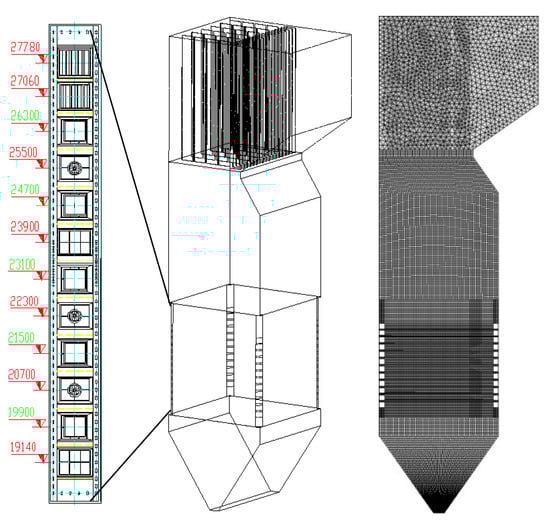 In order to increase the accuracy of the numerical calculation, the boiler was divided into the bottom ash hopper area, the main burner area, the burnout area on the upper part of the furnace, and the platen superheater area, and a grid was drawn for each area. To eliminate pseudo-diffusion in the numerical calculation, the grids for the main combustion area and the nozzle area were densified, as shown in Figure 3. After several cold-state calculations, the final number of the grid elements was .