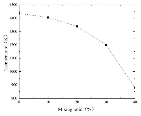 As shown in Figure 4, with a mixing ratio of zero (in this work, the mixing ratio was the proportion of sludge to the total sample), the temperature of the outlet flue gas of the boiler was 1435 K (1162 °C), which was consistent with the actual temperature of the outlet flue gas of the boiler. The results show that the co-combustion of sludge significantly affected the flue-gas temperature at the boiler outlet, and the decreasing rate of the flue-gas temperature at the boiler outlet increased upon increasing the mixed combustion of sludge. When the mixing ratio increased from 0% to 20%, the flue-gas temperature at the boiler outlet only decreased by 98 °C. When the mixing ratio increased to 30%, the flue-gas temperature at the furnace outlet decreased by 240 °C. When the mixing ratio reached 40%, the flue-gas temperature at the boiler outlet was insufficient, indicating an incomplete combustion.