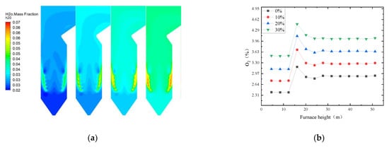 Figure 6a shows the H2O distribution in the boiler for various mixing ratios. From left to right, the mixing ratio is 0%, 10%, 20%, and 30%. When the moisture content of the sludge reached 80%, with the increased co-combustion, more water entered the furnace and the moisture content in the furnace increased as co-combustion increased. Figure 6 shows that as co-combustion increased, the combustion of blended fuel worsened and the boiler temperature decreased; thus, the evaporation and heat absorption of water becomes an important factor that cannot be ignored. When the proportion of sludge in the mixed combustion exceeded 40%, combustion in the boiler was not sufficient and flameout became a possibility. As shown in Figure 6b when the amount of mixed combustion increased, the H2O concentration in the boiler also increased. The H2O in the boiler was mainly concentrated in the burner area. A large amount of C in the sludge affects the combustion of the fuel in the boiler, resulting in poor combustion, which adversely impacts the operation of the boiler.