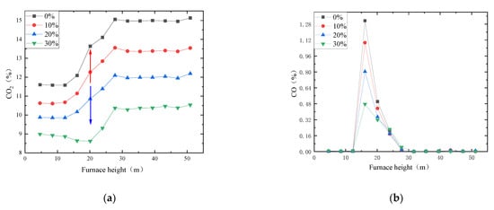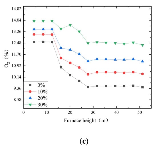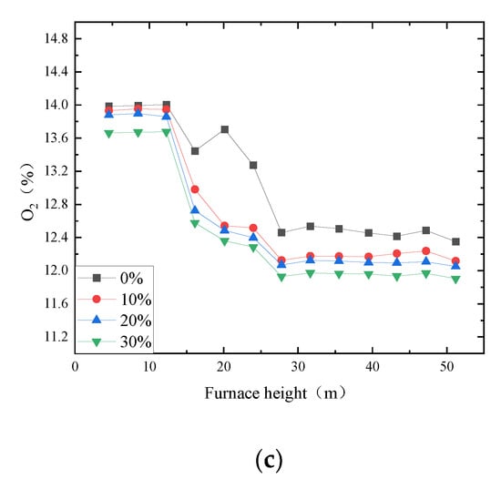 Figure 8 shows the distributions of CO2, CO, and O2 at different heights of the central section of the boiler and for various mixing ratios. In general, the average CO2 concentration increased with boiler height. In the burner area, CO2 increased with height, which is consistent with the trend shown in Figure 7. However, the CO2 concentration in the burner area was not completely consistent under the different mixing ratios. When the mixing ratio was less than 20%, the CO2 concentration followed an upward convex trend; however, when the mixing ratio exceeded 20%, the CO2 concentration followed a downward convex trend, as shown in Figure 8a.