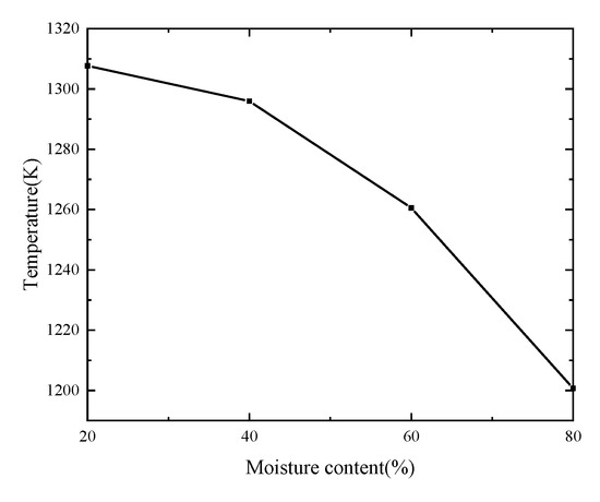 Given that the moisture content of sludge can be as high as 80%, it can seriously affect the stable operation and pollutant emissions of the boiler; thus, reducing the moisture content of sludge improves the furnace temperature and fuel-burnout rate. Figure 10 shows that, with the decrease in moisture content in sludge, the flue-gas temperature at the furnace outlet increased and the rate of temperature increase gradually slowed, with the maximum temperature rate occurring at a 40% moisture content. Decreasing the moisture content from 80% to 20% caused the boiler outlet temperature to increase by approximately 108 K, which effectively improved the burnout rate of the fuel.