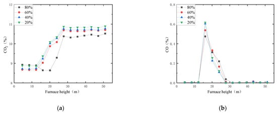 Figure 11a shows the increased CO2 concentration at the bottom of the furnace with an 80% moisture content, whereby the CO2 concentration decreased near the burner. This is attributed to the lower furnace temperature at the bottom burner and the high moisture-content fuel absorbing a lot of heat at the bottom burner, which affected the normal combustion of the fuel. Therefore, given the decrease in CO2 concentration at the bottom burner, the corresponding O2 concentration increased, as shown in Figure 11c. Reducing the moisture content of the fuel to 60% decreased the influence of the moisture content at the bottom burner and the CO2 concentration at the burner increased with height in the furnace. Upon decreasing the moisture content, the furnace temperature increased and the concentration of the intermediate product increased, as shown in Figure 11b. When the moisture content was 80%, the CO content decreased to 0% at approximately 32 m. When the moisture content was less than 60%, the CO content decreased to 0% at approximately 27 m.