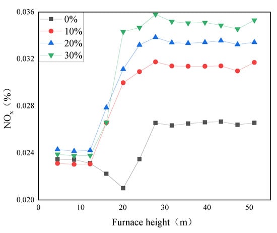 Two types of NOx existed in the furnace: fuel NOx and thermal NOx. Near the burner, on the one hand, the mixed combustion of sludge increased fuel NOx; on the other hand, the thermal NOx decreased due to the evaporation and heat absorption of water in the sludge. Therefore, the total amount of NOx depended on the mixing ratio. When the mixing ratio was 10%, the furnace temperature remained high, and the total amount of thermal NOx and fuel NOx was maximal. When the mixing ratio exceeded 10%, the growth rate of thermal NOx was less than that of fuel NOx, so the overall trend was upward. When the mixing ratio reached 30%, the NOx did not decrease in the bottom layer of the burner. There are two main factors that explain this phenomenon: (1) incomplete combustion caused by the high mixing ratio and a reduction in fuel-type NOx; and (2) a low rate of thermal-type NOx generation caused by the low furnace temperature. When the mixing ratio was 20%, the NOx emission was the largest, increasing by approximately 11.3%. This finding is consistent with the report of Chen et al. [27].