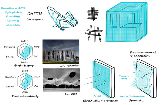 - Hubert, T.; Wu, T.V.; Dugué, A.; Bruneau, D.; Aujard, F. A Framework for the Design of Bioinspired Building Envelopes: Case Study of An Adaptive Skin Inspired by the Morpho Butterfly. In Proceedings of the Advanced Building Skin Conference, Bern, Switzerland, 21–22 October 2021; p. 9. [Google Scholar]