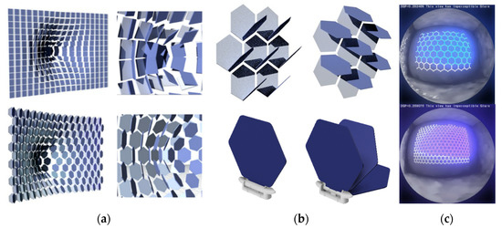 Form-finding and visual representation helped define the form of the mesh elements. The hexagonal shape was chosen over squares as it removed physical collisions between opened flaps when the mesh was deformed, as shown in Figure 2a. Projected light simulations foreshadowed various scenarios when changing the orientation of the flaps along the mesh; hence, this parameter was selected and technically implemented into the prototype by designing a notched system (Figure 2b). Last, the size of the elements was arbitrarily set as a trade-off between the minimum size for ease of manufacture and the maximum acceptable size by the occupants in terms of view towards the exterior environment (Figure 2c).