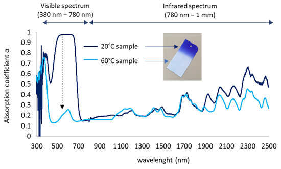 Absorption coefficient of paint measured at 20 °C and 60 °C. The black arrow on the graph shows a high variation in the coefficient in the visible spectrum.