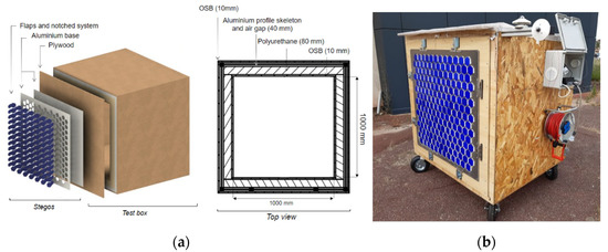 (a) Diagram of the tests box with the Stegos as an opaque wall. (b) Photograph of the test box with the Stegos integrated on one of the façades.
