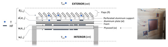 Thermocouple sensors taped on flaps and welded on all heat flux sensors measured surface temperature where heat flows are measured. Copper foil heat flux sensors with tangential gradients of varying sizes (surfaces from 3 mm × 3 mm to 30 mm × 30 mm, thickness of 5 mm) were duplicated on some layers; even though these sensors were all calibrated beforehand, ‘incorrect’ measurements were still possible because of several factors such as an improper set-up of the sensors or unpredictable issues during experimentation. The repartition of the sensors is illustrated in Figure 7. Note that a 5 mm foam was added between the aluminum plate and the plywood to ensure no air gap.