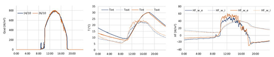 Layering of measurements performed on the test box during two separate days. Incident solar radiation, air temperatures, and heat flows. Measurements on 14 October 2021: closed flaps. Measurements on 26 October 2021: opened flap with a 90° angle, along a horizontal rotation axis (solar cap configuration).