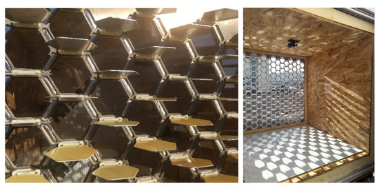 Photos of the experimentation set for the Stegos ‘glazing’ are shown in Figure 11. Pictures of the projected light and shadow on the bottom surface every 10 min of the day were taken using the camera fixed on top of the test box. The configuration sets for the test box were identical to the ones used for the experimental protocol of the ‘opaque’ configuration.